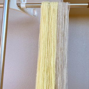 まだまだ文旦の羊毛は残っていますが、少しずつ大切に紡いでいきます。今回はカードを念入りに。心持ち太めに単糸を紡ぎ、ふわっと双糸にしました。
